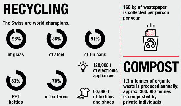 Switzerland has one of the highest municipal solid waste volumes in the world, at 716 kg of waste per person and year. Nearly 53% of it is recycled.